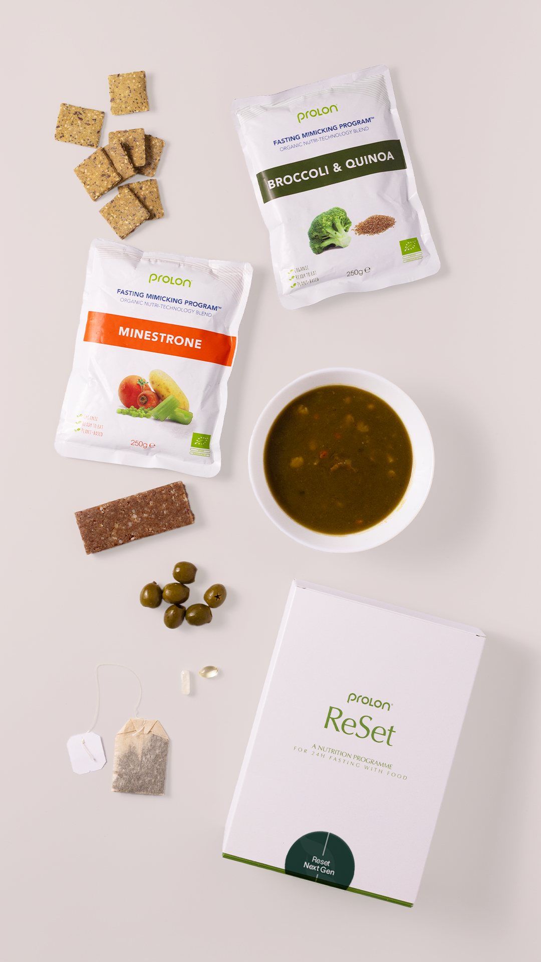Kit per un giorno di mima-digiuno con zuppe pronte al consumo (già liquide, da semplicemente scaldare), realizzate con una tecnologia avanzata che preserva le qualità organolettiche degli ingredienti freschi, mantenendo intatti il gusto autentico e le proprietà nutrizionali.